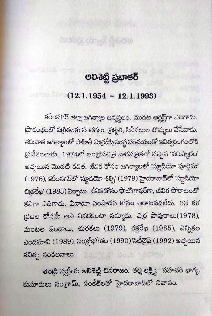 Alishetty Prabhakar Books In Telugu, Showcasing great Telugu literature. Narsan Telugu Kavitalu Telugu Kavithalu Kavithalu Telugu kavita Poetry Kavitwam Kavitalu Multiple Authors PrajaSakthi Book House Praja Sakthi Book House Praja Sakti Book House Prajasakti Book House Nava Telangana Publishing House. Alishetty Prabhakr may be the only one who born and died on the same day He born on 1-1-1954 and died on 1-1-1994. 100 Haasya Kathalu100 హసయ కథల.